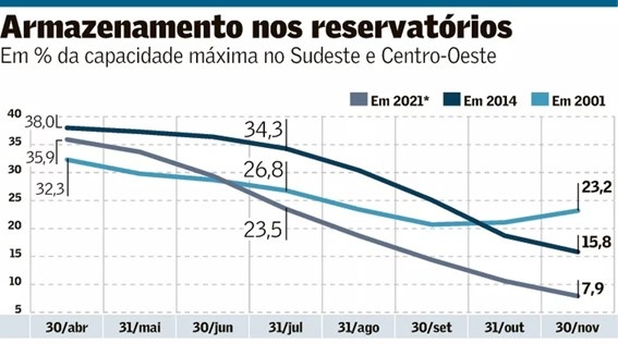 Evolution of water levels in hydropower reservoirs in the Southeast/Central Subsystem – 2001, 2014 vs. outlook for 2021