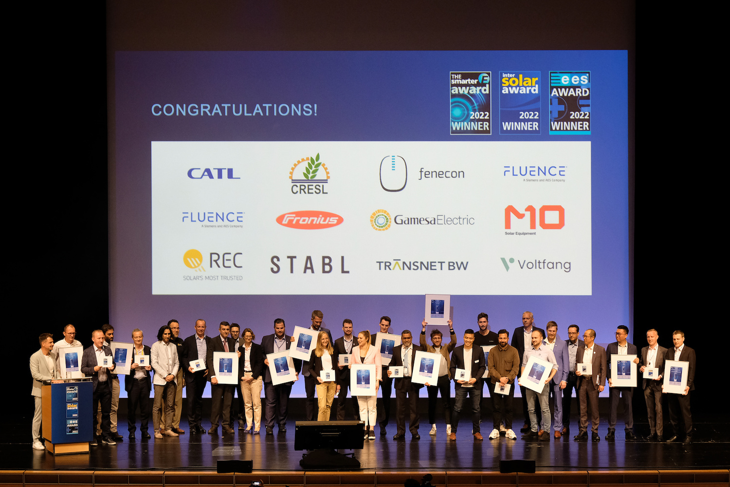 Munich/Pforzheim, May 10, 2022. The EnerOne battery storage system, the STABL SI 100 modular multi-level converter and the Voltfang Industrial commercial storage system made from second-life car batteries are all examples of innovative products within the storage industry. This fact has been recognized by the ees AWARD 2022. The manufacturers Contemporary Amperex Technology Limited (CATL), STABL Energy and Voltfang are the proud winners of the prize for innovation. The ees AWARD was presented at a ceremony on May 10, 2022 along with two other prizes for innovation, The smarter E AWARD and the Intersolar AWARD. The awards honor the innovative products and projects of future-oriented companies that play a key role in the success of the new energy world. The winners and finalists will be showcasing their innovations at The smarter Europe 2022 at Messe München from May 11 to 13.